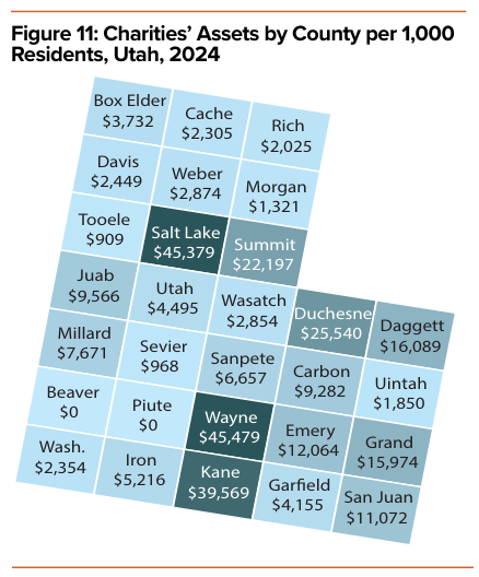 From a quantitative perspective, Utah’s charities add a relatively large value to the state. In terms of income and assets per capita, Utah outperforms the nation by about 75%. This is not equal across the counties. In fact, little Kane County ranks near the top of the list, largely due to Best Friends Animal Sanctuary.