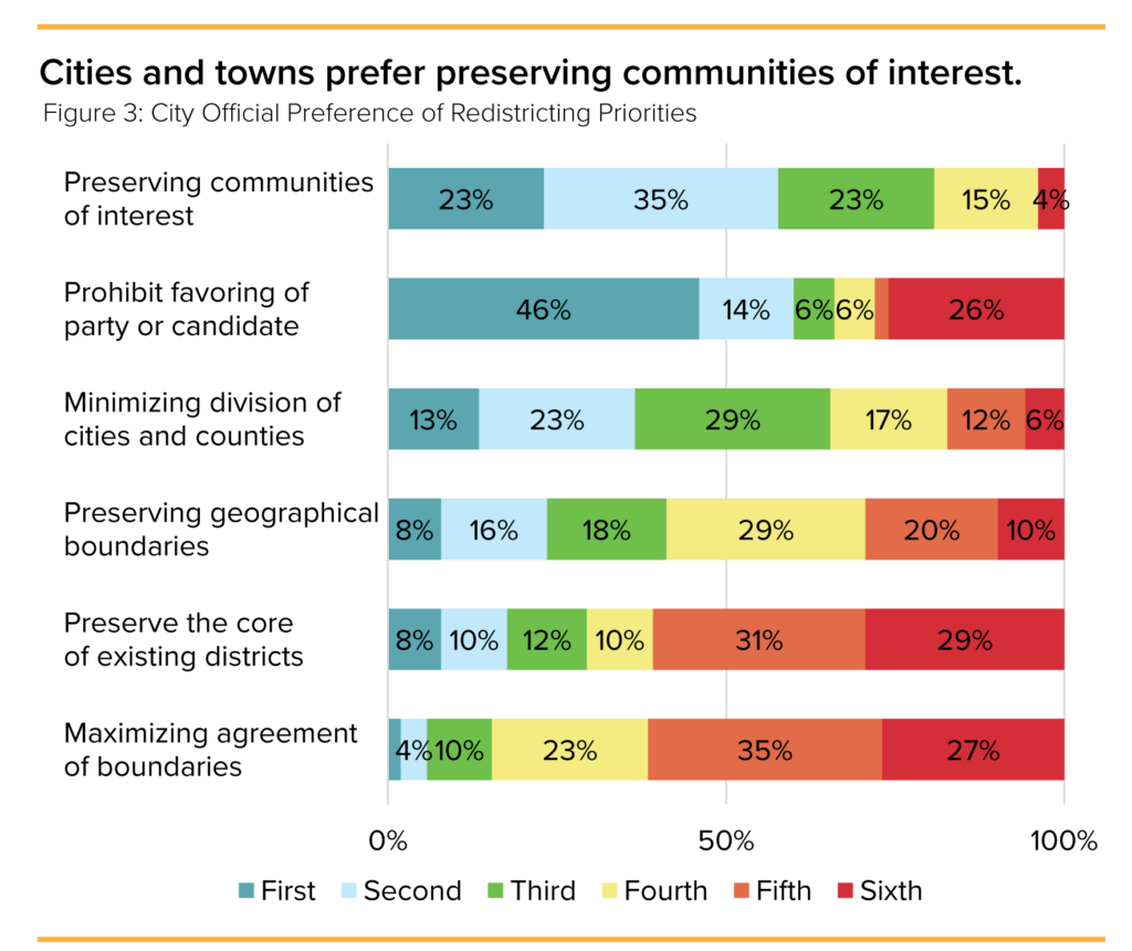 Preserving communities of interest and avoiding partisan gerrymanders were most important for city officials. Keeping geographical and man-made boundaries, such as cities and counties, was of secondary importance. Keeping the existing core of districts and maximizing boundary agreement were the least important items.