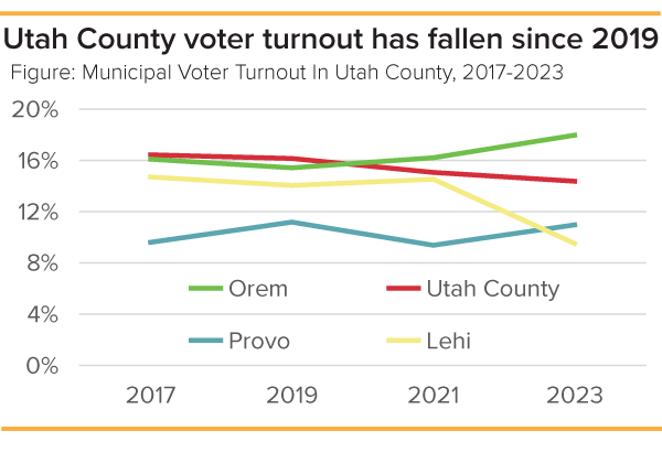 In past elections, cities in Utah County outperformed the state average. However, in 2023, the average turnout fell to 14%.