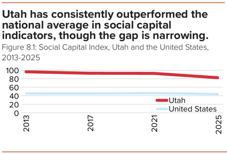 “Utah’s Social Capital Index score stands at 82 out of 100, which is a continuing downward slide from 2013, when Utah stood at 96. This compares to the United States, which stands at 44.”