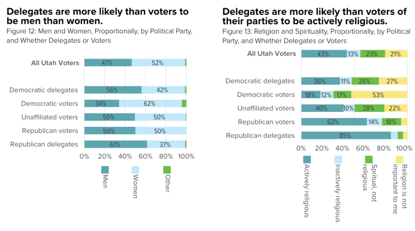 The report found that delegates from both parties are more pessimistic than their voter counterparts, noting that Utah is on the wrong track and that their quality of life has decreased. It found that Utah’s Republican delegates are somewhat more conservative than Republican voters, while Democratic delegates are about the same as Democratic voters. And it found that Republican delegates place less importance on housing, roads, air quality, and crime when compared to Republican voters, while Democratic delegates focus more on education content and less on healthcare and homelessness when compared to Democratic voters.