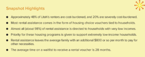When thinking about rental assistance, “affordable” means housing expenses do not exceed 30% of a household’s income. If a family is paying more than 30% of their income on housing, they are considered “cost burdened.” And if a family is paying more than 50% of their income on housing, they are considered “severely cost burdened.” Approximately 48% of Utah’s renters are cost-burdened, and 20% are severely cost-burdened. This burden implies the need to support some families with their rent.